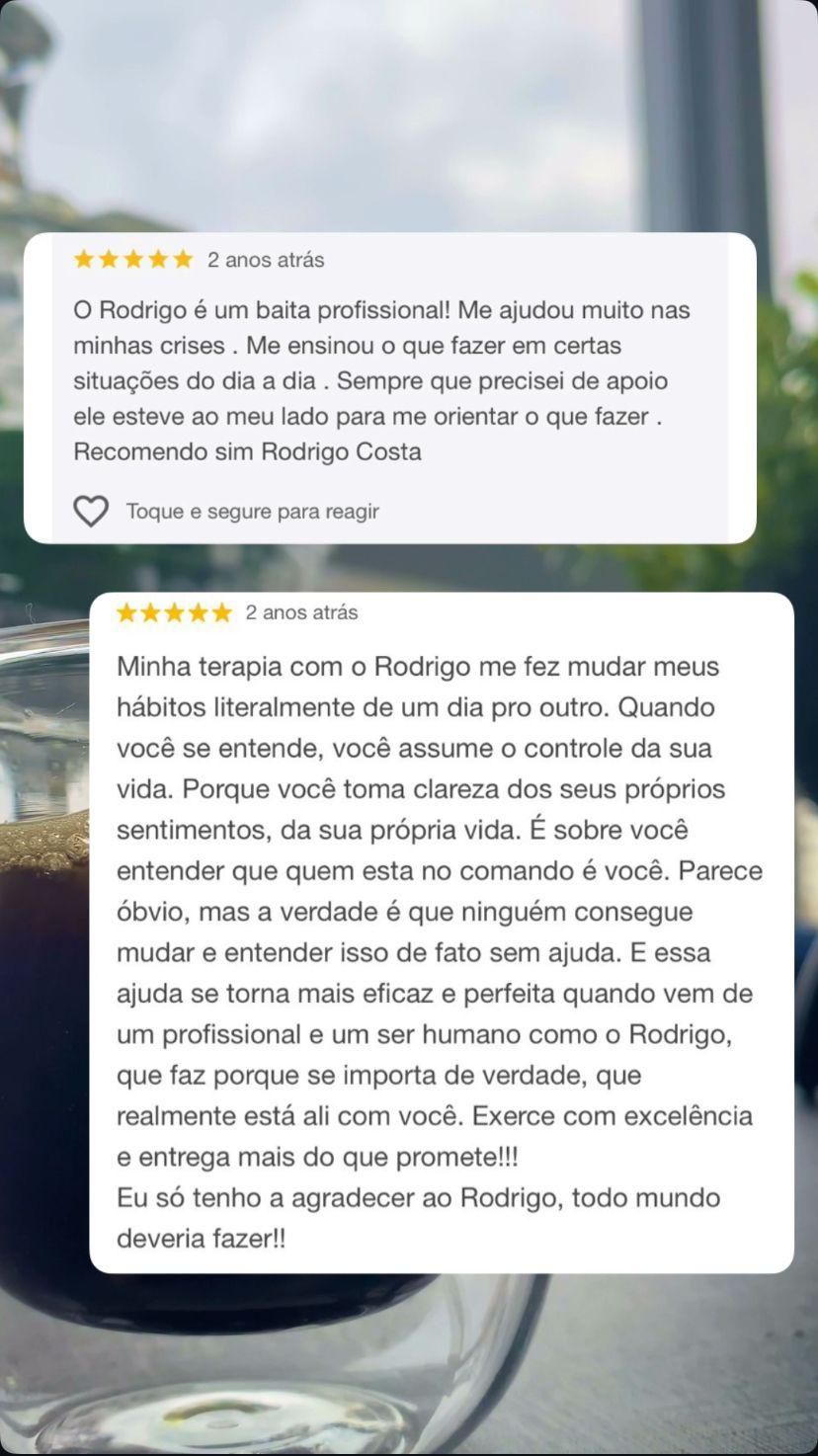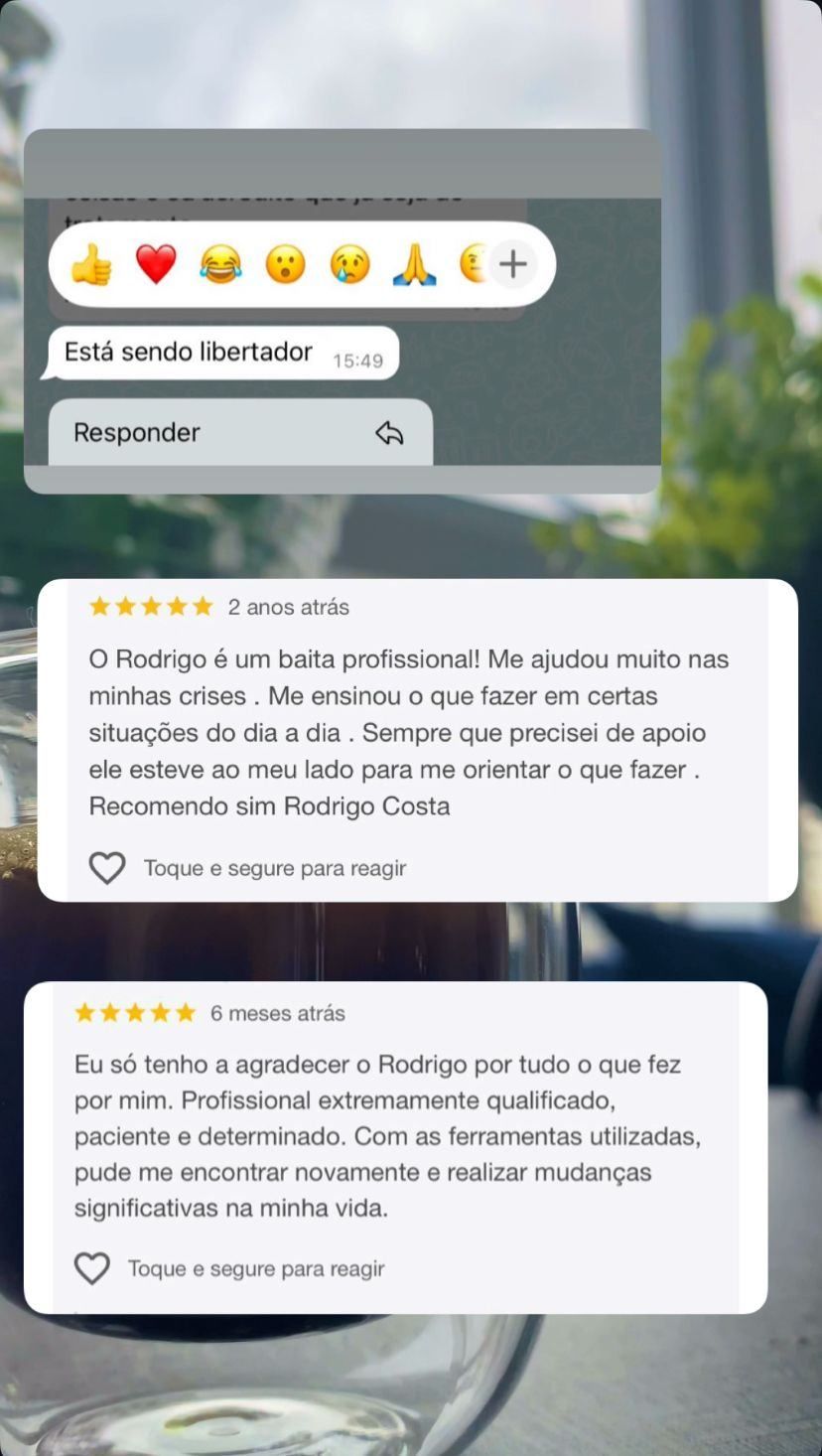 Meu nome é Rodrigo Costa, sou terapeuta com mais de 20 anos de experiência na área da saúde, e dedico minha vida a ajudar pessoas a reencontrarem o equilíbrio emocional e a retomarem o controle de suas próprias histórias.